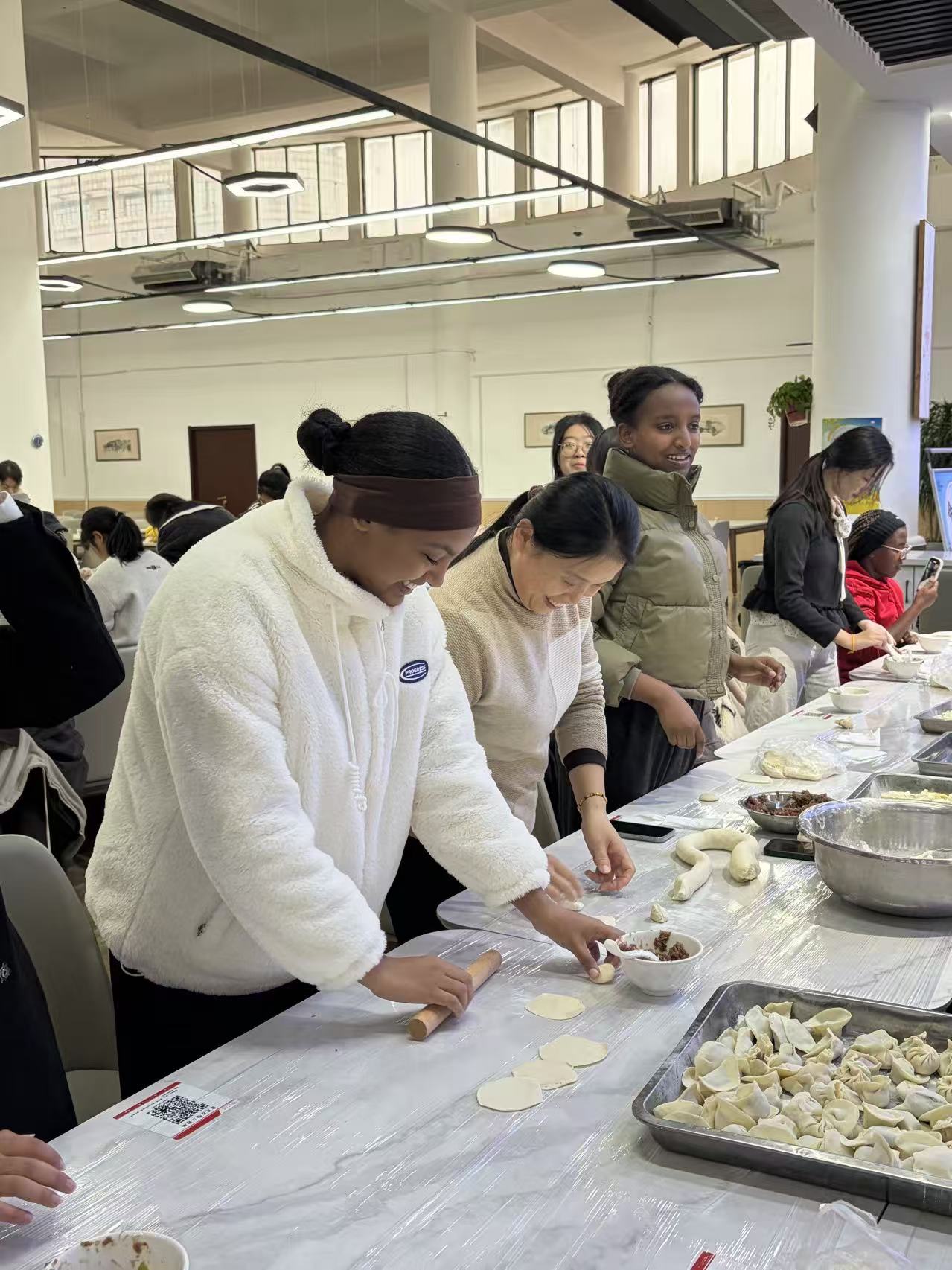 活动现场气氛热烈,欢声笑语不断。在国际交流学院老师的简要介绍下,中外学生首先了解了冬至在中国传统文化中的重要地位及其蕴含的“团圆”“纳福”等美好寓意。随后,在国际交流学院精心准备的食材和器具前,活动进入实践环节。中国学生们主动担当起“文化使者”和“技术指导”,从擀皮、放馅到捏边,一步步向来自世界各地的留学生们耐心演示饺子的制作技巧。留学生们兴趣盎然,认真观摩,积极尝试。从最初的手法生疏、饺子形态各异,到逐渐掌握要领、包出有模有样的饺子,整个过程中充满了互助与学习的热情。大家边包边聊,不仅交流包饺子的心得,更分享各自国家的节日习俗与美食文化。